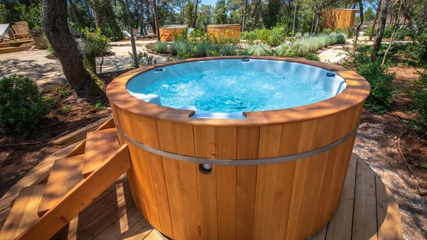 Luxe, dat is wat deze camping uitstraalt. Er is dan wel geen zwembad, maar wel een Spa met bubbelbaden, sauna, relaxruimtes, fitness, yoga en u kunt hier diverse behandelingen ondergaan in een van de luxe behandeltenten. Het strand is hier nooit ver weg. Bij het rots- en kiezelstrand zorgen pijnbomen voor heerlijke schaduw terwijl u op uw zonnebedje geniet van het prachtige uitzicht over de helderblauwe zee.